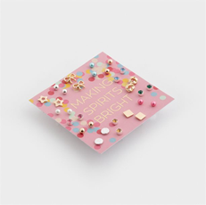 Oblíbené jsou sady náušnic v různém designu. Sady obsahují až 15 párů náušniček ve stříbrném, zlatém a růžově zlatém odstínu. Jako třeba v oblíbené dárkové sadě Chelsea. Náušnice jsou vyrobeny ze zinku, hliníku, nerezové oceli.